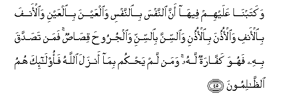 45. Wakatabna AAalayhim feeha anna alnnafsa bialnnafsi waalAAayna bialAAayni waal-anfa bial-anfi waalothuna bialothuni waalssinna bialssinni waaljurooha qisasun faman tasaddaqa bihi fahuwa kaffaratun lahu waman lam yahkum bima anzala Allahu faola-ika humu alththalimoona