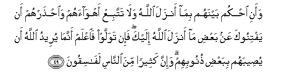 49. Waani ohkum baynahum bima anzala Allahu wala tattabiAA ahwaahum waihtharhum an yaftinooka AAan baAAdi ma anzala Allahu ilayka fa-in tawallaw faiAAlam annama yureedu Allahu an yuseebahum bibaAAdi thunoobihim wa-inna katheeran mina alnnasi lafasiqoona