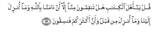 59. Qul ya ahla alkitabi hal tanqimoona minna illa an amanna biAllahi wama onzila ilayna wama onzila min qablu waanna aktharakum fasiqoona