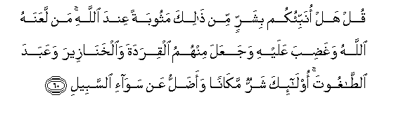 60. Qul hal onabbi-okum bisharrin min thalika mathoobatan AAinda Allahi man laAAanahu Allahu waghadiba AAalayhi wajaAAala minhumu alqiradata waalkhanazeera waAAabada alttaghooti ola-ika sharrun makanan waadallu AAan sawa-i alssabeeli
