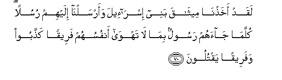 70. Laqad akhathna meethaqa banee isra-eela waarsalna ilayhim rusulan kullama jaahum rasoolun bima la tahwa anfusuhum fareeqan kaththaboo wafareeqan yaqtuloona