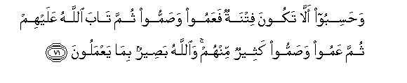 71. Wahasiboo alla takoona fitnatun faAAamoo wasammoo thumma taba Allahu AAalayhim thumma AAamoo wasammoo katheerun minhum waAllahu baseerun bima yaAAmaloona