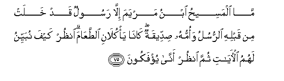 75. Ma almaseehu ibnu maryama illa rasoolun qad khalat min qablihi alrrusulu waommuhu siddeeqatun kana ya/kulani alttaAAama onthur kayfa nubayyinu lahumu al-ayati thumma onthur anna yu/fakoona