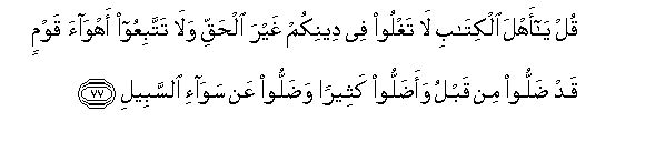 77. Qul ya ahla alkitabi la taghloo fee deenikum ghayra alhaqqi wala tattabiAAoo ahwaa qawmin qad dalloo min qablu waadalloo katheeran wadalloo AAan sawa-i alssabeeli