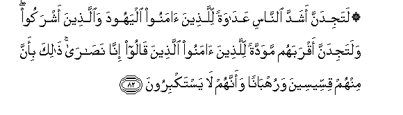 82. Latajidanna ashadda alnnasi AAadawatan lillatheena amanoo alyahooda waallatheena ashrakoo walatajidanna aqrabahum mawaddatan lillatheena amanoo allatheena qaloo inna nasara thalika bi-anna minhum qisseeseena waruhbanan waannahum la yastakbiroona