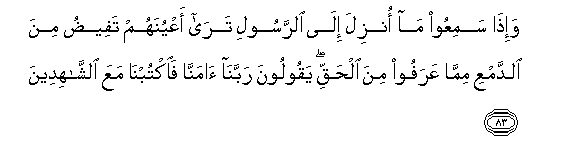 83. Wa-itha samiAAoo ma onzila ila alrrasooli tara aAAyunahum tafeedu mina alddamAAi mimma AAarafoo mina alhaqqi yaqooloona rabbana amanna faoktubna maAAa alshshahideena