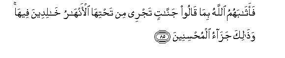 85. Faathabahumu Allahu bima qaloo jannatin tajree min tahtiha al-anharu khalideena feeha wathalika jazao almuhsineena