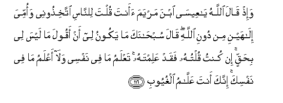 116. Wa-ith qala Allahu ya AAeesa ibna maryama aanta qulta lilnnasi ittakhithoonee waommiya ilahayni min dooni Allahi qala subhanaka ma yakoonu lee an aqoola ma laysa lee bihaqqin in kuntu qultuhu faqad AAalimtahu taAAlamu ma fee nafsee wala aAAlamu ma fee nafsika innaka anta AAallamu alghuyoobi