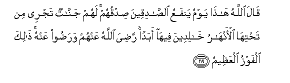 119. Qala Allahu hatha yawmu yanfaAAu alssadiqeena sidquhum lahum jannatun tajree min tahtiha al-anharu khalideena feeha abadan radiya Allahu AAanhum waradoo AAanhu thalika alfawzu alAAatheemu