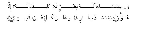 17. Wa-in yamsaska Allahu bidurrin fala kashifa lahu illa huwa wa-in yamsaska bikhayrin fahuwa AAala kulli shay-in qadeerun