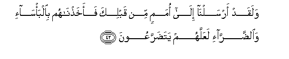 42. Walaqad arsalna ila omamin min qablika faakhathnahum bialba/sa-i waalddarra-i laAAallahum yatadarraAAoona