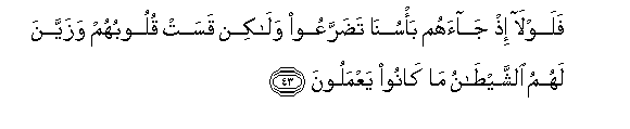 43. Falawla ith jaahum ba/suna tadarraAAoo walakin qasat quloobuhum wazayyana lahumu alshshaytanu ma kanoo yaAAmaloona