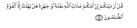 47. Qul araaytakum in atakum AAathabu Allahi baghtatan aw jahratan hal yuhlaku illa alqawmu alththalimoona
