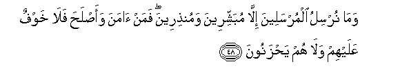 48. Wama nursilu almursaleena illa mubashshireena wamunthireena faman amana waaslaha fala khawfun AAalayhim wala hum yahzanoona
