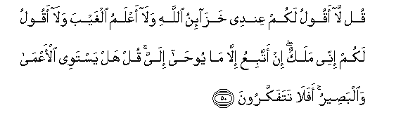 50. Qul la aqoolu lakum AAindee khaza-inu Allahi wala aAAlamu alghayba wala aqoolu lakum innee malakun in attabiAAu illa ma yooha ilayya qul hal yastawee al-aAAma waalbaseeru afala tatafakkaroona