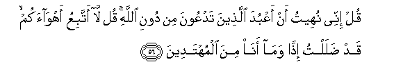56. Qul innee nuheetu an aAAbuda allatheena tadAAoona min dooni Allahi qul la attabiAAu ahwaakum qad dalaltu ithan wama ana mina almuhtadeena