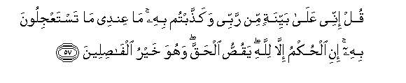 57. Qul innee AAala bayyinatin min rabbee wakaththabtum bihi ma AAindee ma tastaAAjiloona bihi ini alhukmu illa lillahi yaqussu alhaqqa wahuwa khayru alfasileena