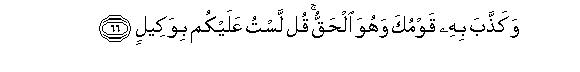 66. Wakaththaba bihi qawmuka wahuwa alhaqqu qul lastu AAalaykum biwakeelin