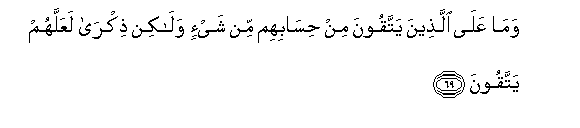 69. Wama AAala allatheena yattaqoona min hisabihim min shay-in walakin thikra laAAallahum yattaqoona