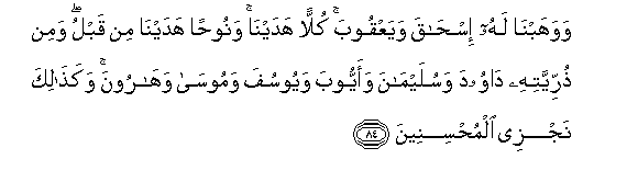 84. Wawahabna lahu ishaqa wayaAAqooba kullan hadayna wanoohan hadayna min qablu wamin thurriyyatihi dawooda wasulaymana waayyooba wayoosufa wamoosa waharoona wakathalika najzee almuhsineena