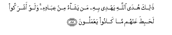 88. Thalika huda Allahi yahdee bihi man yashao min AAibadihi walaw ashrakoo lahabita AAanhum ma kanoo yaAAmaloona