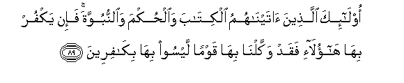 89. Ola-ika allatheena ataynahumu alkitaba waalhukma waalnnubuwwata fa-in yakfur biha haola-i faqad wakkalna biha qawman laysoo biha bikafireena