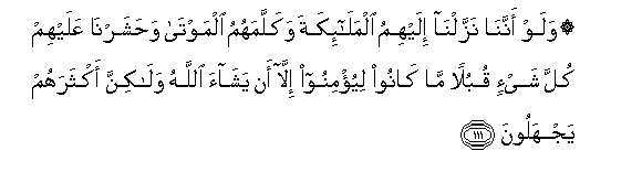 111. Walaw annana nazzalna ilayhimu almala-ikata wakallamahumu almawta wahasharna AAalayhim kulla shay-in qubulan ma kanoo liyu/minoo illa an yashaa Allahu walakinna aktharahum yajhaloona