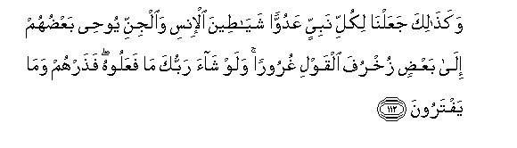 112. Wakathalika jaAAalna likulli nabiyyin AAaduwwan shayateena al-insi waaljinni yoohee baAAduhum ila baAAdin zukhrufa alqawli ghurooran walaw shaa rabbuka ma faAAaloohu fatharhum wama yaftaroona