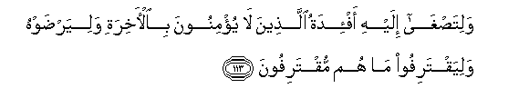 113. Walitasgha ilayhi af-idatu allatheena la yu/minoona bial-akhirati waliyardawhu waliyaqtarifoo ma hum muqtarifoona
