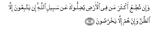 116. Wa-in tutiAA akthara man fee al-ardi yudillooka AAan sabeeli Allahi in yattabiAAoona illa alththanna wa-in hum illa yakhrusoona