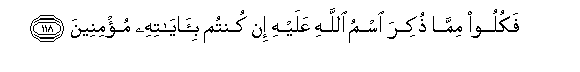 118. Fakuloo mimma thukira ismu Allahi AAalayhi in kuntum bi-ayatihi mu/mineena