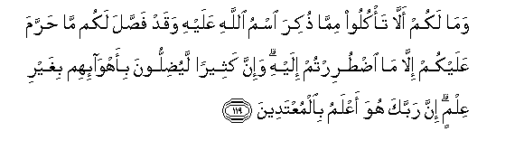 119. Wama lakum alla ta/kuloo mimma thukira ismu Allahi AAalayhi waqad fassala lakum ma harrama AAalaykum illa ma idturirtum ilayhi wa-inna katheeran layudilloona bi-ahwa-ihim bighayri AAilmin inna rabbaka huwa aAAlamu bialmuAAtadeena