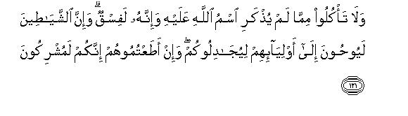 121. Wala ta/kuloo mimma lam yuthkari ismu Allahi AAalayhi wa-innahu lafisqun wa-inna alshshayateena layoohoona ila awliya-ihim liyujadilookum wa-in ataAAtumoohum innakum lamushrikoona