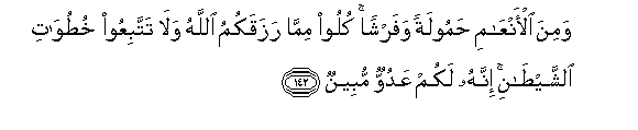 142. Wamina al-anAAami hamoolatan wafarshan kuloo mimma razaqakumu Allahu wala tattabiAAoo khutuwati alshshaytani innahu lakum AAaduwwun mubeenun