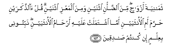 143. Thamaniyata azwajin mina aldda/ni ithnayni wamina almaAAzi ithnayni qul alththakarayni harrama ami alonthayayni amma ishtamalat AAalayhi arhamu alonthayayni nabbi-oonee biAAilmin in kuntum sadiqeena