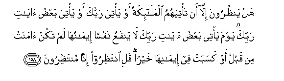 158. Hal yanthuroona illa an ta/tiyahumu almala-ikatu aw ya/tiya rabbuka aw ya/tiya baAAdu ayati rabbika yawma ya/tee baAAdu ayati rabbika la yanfaAAu nafsan eemanuha lam takun amanat min qablu aw kasabat fee eemaniha khayran quli intathiroo inna muntathiroona