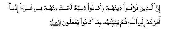 159. Inna allatheena farraqoo deenahum wakanoo shiyaAAan lasta minhum fee shay-in innama amruhum ila Allahi thumma yunabbi-ohum bima kanoo yafAAaloona