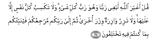 164. Qul aghayra Allahi abghee rabban wahuwa rabbu kulli shay-in wala taksibu kullu nafsin illa AAalayha wala taziru waziratun wizra okhra thumma ila rabbikum marjiAAukum fayunabbi-okum bima kuntum feehi takhtalifoona
