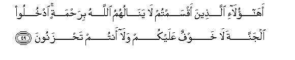 49. Ahaola-i allatheena aqsamtum la yanaluhumu Allahu birahmatin odkhuloo aljannata la khawfun AAalaykum wala antum tahzanoona