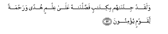 52. Walaqad ji/nahum bikitabin fassalnahu AAala AAilmin hudan warahmatan liqawmin yu/minoona