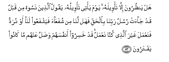 53. Hal yanthuroona illa ta/weelahu yawma ya/tee ta/weeluhu yaqoolu allatheena nasoohu min qablu qad jaat rusulu rabbina bialhaqqi fahal lana min shufaAAaa fayashfaAAoo lana aw nuraddu fanaAAmala ghayra allathee kunna naAAmalu qad khasiroo anfusahum wadalla AAanhum ma kanoo yaftaroona
