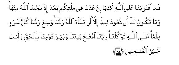 89. Qadi iftarayna AAala Allahi kathiban in AAudna fee millatikum baAAda ith najjana Allahu minha wama yakoonu lana an naAAooda feeha illa an yashaa Allahu rabbuna wasiAAa rabbuna kulla shay-in AAilman AAala Allahi tawakkalna rabbana iftah baynana wabayna qawmina bialhaqqi waanta khayru alfatiheena
