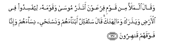 127. Waqala almalao min qawmi firAAawna atatharu moosa waqawmahu liyufsidoo fee al-ardi wayatharaka waalihataka qala sanuqattilu abnaahum wanastahyee nisaahum wa-inna fawqahum qahiroona
