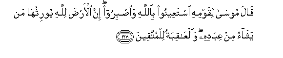 128. Qala moosa liqawmihi istaAAeenoo biAllahi waisbiroo inna al-arda lillahi yoorithuha man yashao min AAibadihi waalAAaqibatu lilmuttaqeena
