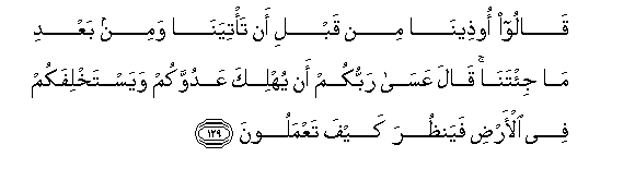 129. Qaloo ootheena min qabli an ta/tiyana wamin baAAdi ma ji/tana qala AAasa rabbukum an yuhlika AAaduwwakum wayastakhlifakum fee al-ardi fayanthura kayfa taAAmaloona