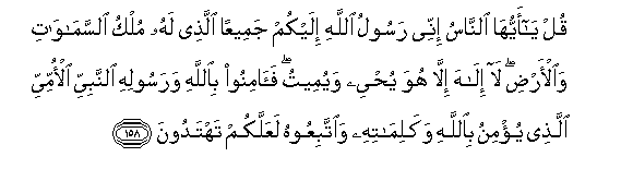 158. Qul ya ayyuha alnnasu innee rasoolu Allahi ilaykum jameeAAan allathee lahu mulku alssamawati waal-ardi la ilaha illa huwa yuhyee wayumeetu faaminoo biAllahi warasoolihi alnnabiyyi al-ommiyyi allathee yu/minu biAllahi wakalimatihi waittabiAAoohu laAAallakum tahtadoona