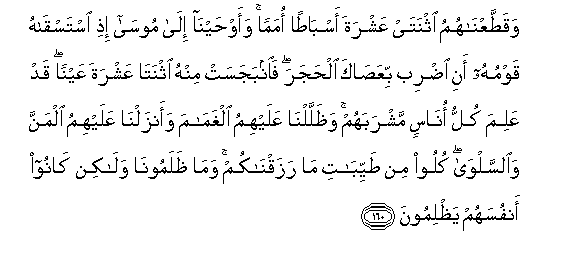 160. WaqattaAAnahumu ithnatay AAashrata asbatan omaman waawhayna ila moosa ithi istasqahu qawmuhu ani idrib biAAasaka alhajara fainbajasat minhu ithnata AAashrata AAaynan qad AAalima kullu onasin mashrabahum wathallalna AAalayhimu alghamama waanzalna AAalayhimu almanna waalssalwa kuloo min tayyibati ma razaqnakum wama thalamoona walakin kanoo anfusahum yathlimoona