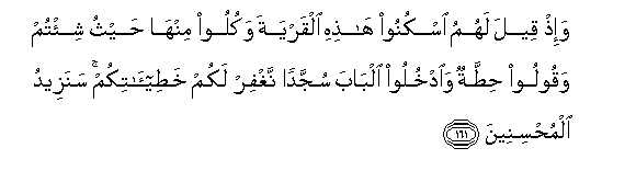 161. Wa-ith qeela lahumu oskunoo hathihi alqaryata wakuloo minha haythu shi/tum waqooloo hittatun waodkhuloo albaba sujjadan naghfir lakum khatee-atikum sanazeedu almuhsineena