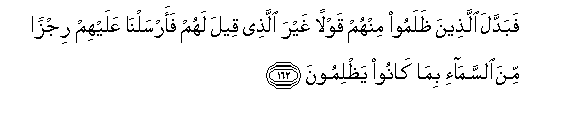 162. Fabaddala allatheena thalamoo minhum qawlan ghayra allathee qeela lahum faarsalna AAalayhim rijzan mina alssama-i bima kanoo yathlimoona