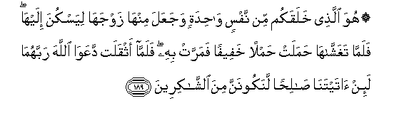189. Huwa allathee khalaqakum min nafsin wahidatin wajaAAala minha zawjaha liyaskuna ilayha falamma taghashshaha hamalat hamlan khafeefan famarrat bihi falamma athqalat daAAawa Allaha rabbahuma la-in ataytana salihan lanakoonanna mina alshshakireena